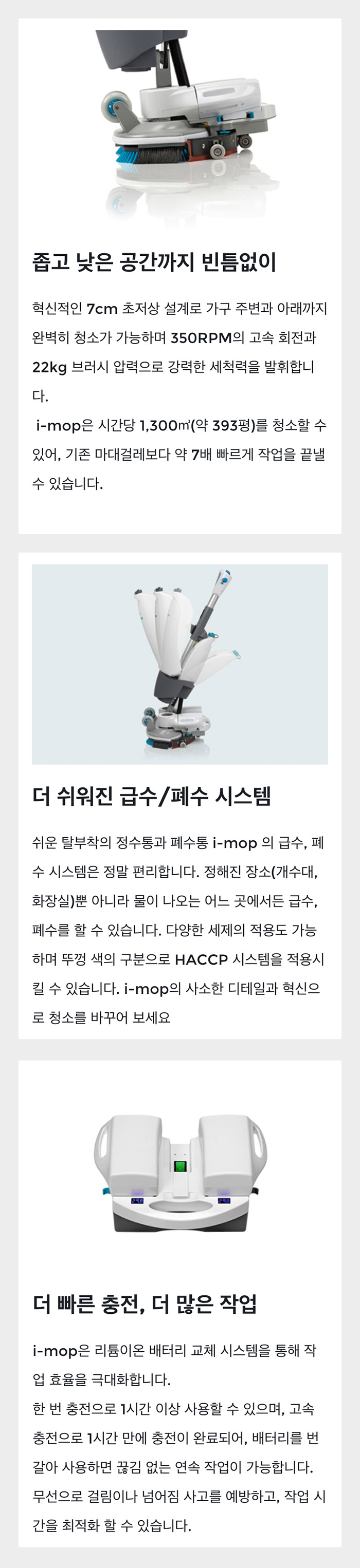 i-mop은 리튬이온 배터리 교체 시스템을 통해 작업 효율을 극대화합니다. |